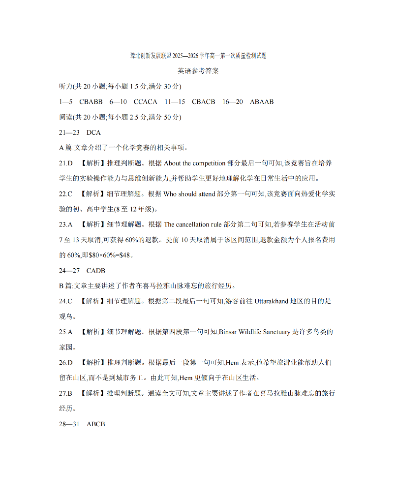 河南省豫北创新发展联盟2025-2026学年高一上学期第一次质量检测 英语答案.pdf