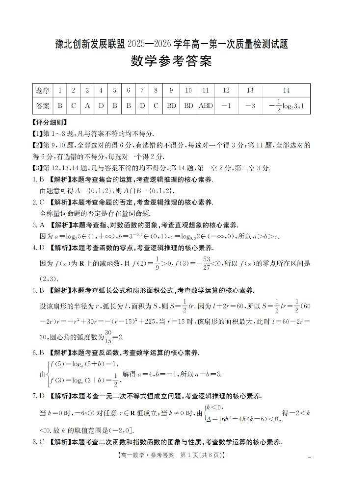 河南省豫北创新发展联盟2025-2026学年高一上学期第一次质量检测 数学答案.pdf