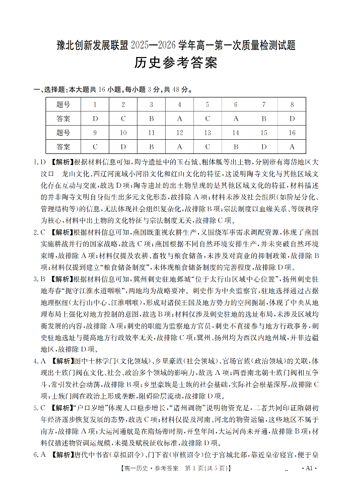 河南省豫北创新发展联盟2025-2026学年高一上学期第一次质量检测 历史答案.pdf