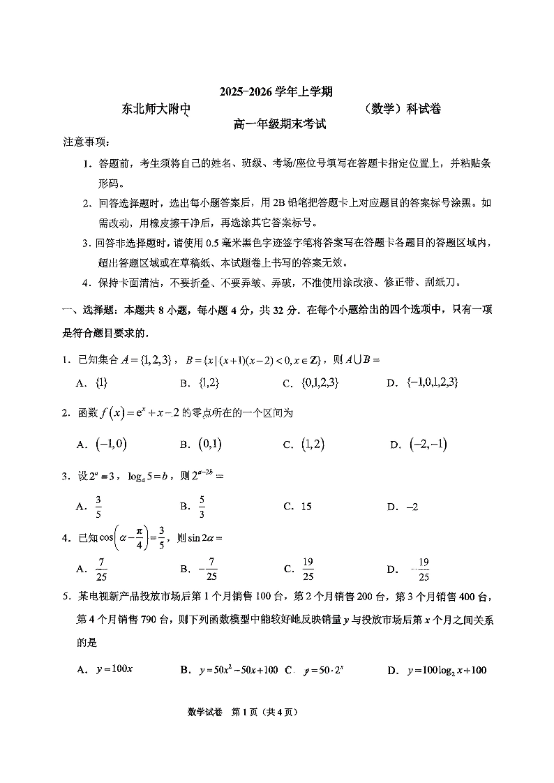吉林省东北师大附中2025-2026学年上学期高一年级期末考试 数学.pdf