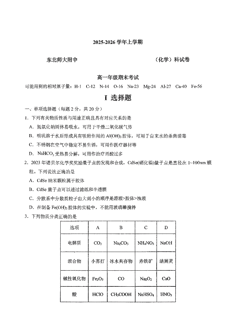 吉林省东北师大附中2025-2026学年上学期高一年级期末考试 化学.pdf