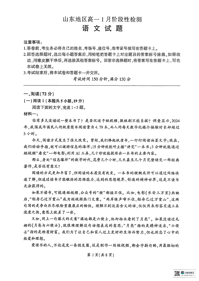 山东省济南市名校联考2025-2026学年高一上学期1月阶段性检测 语文.pdf