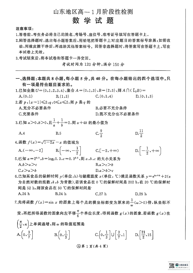 山东省济南市名校联考2025-2026学年高一上学期1月阶段性检测 数学.pdf