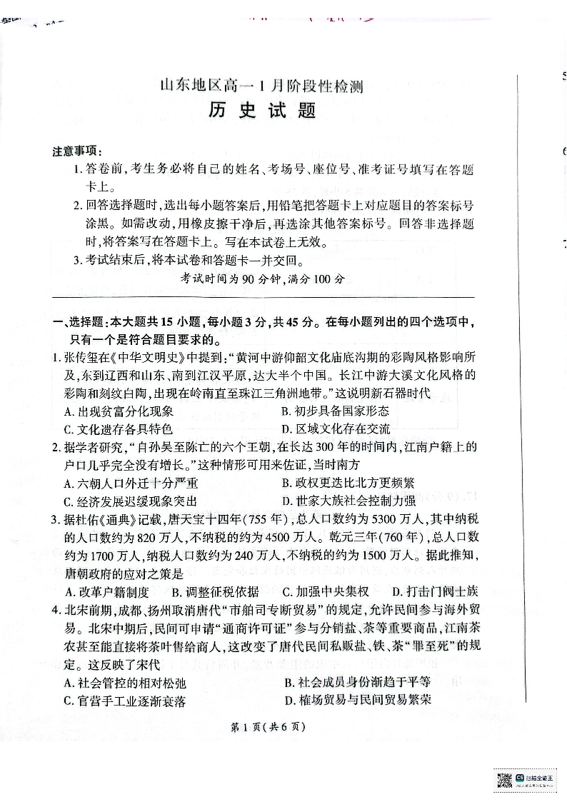 山东省济南市名校联考2025-2026学年高一上学期1月阶段性检测 历史.pdf