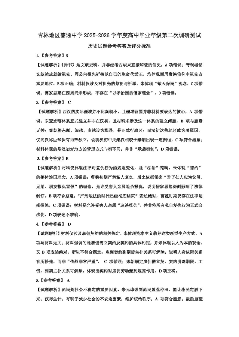 吉林地区普通高中2025-2026学年度高中毕业年级第二次调研测试 历史答案.pdf