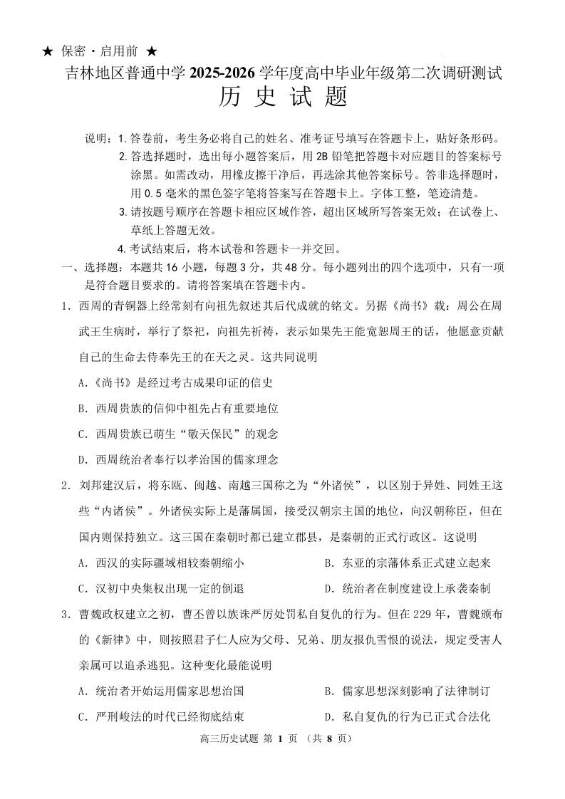 吉林地区普通高中2025-2026学年度高中毕业年级第二次调研测试 历史.docx