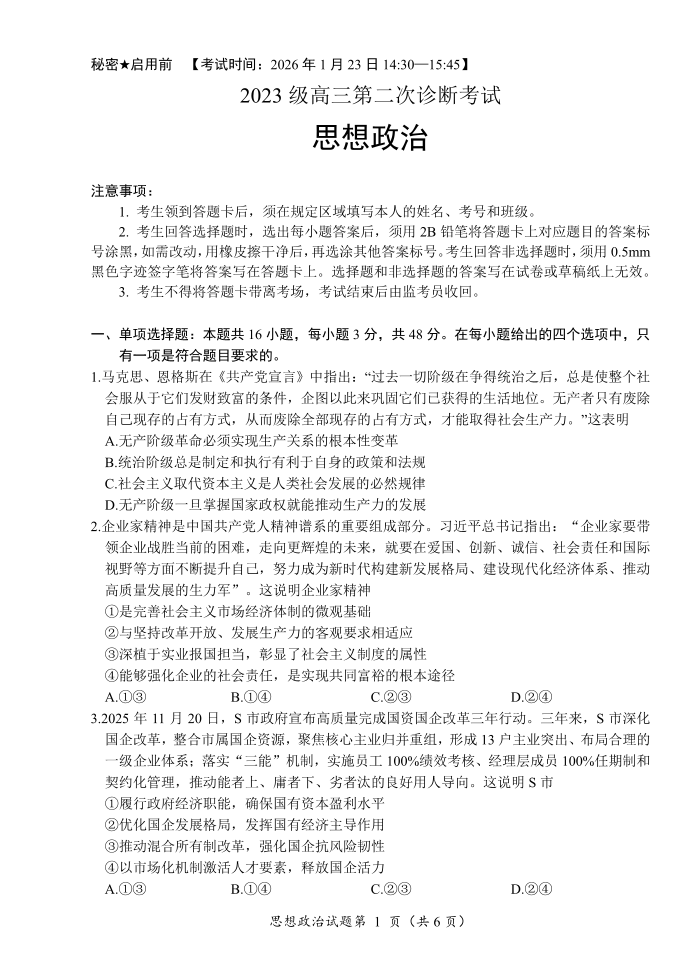 “元三维大联考”2023级高三第二次诊断考试 政治.pdf