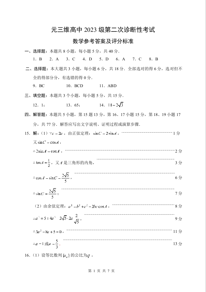 “元三维大联考”2023级高三第二次诊断考试 数学答案.docx