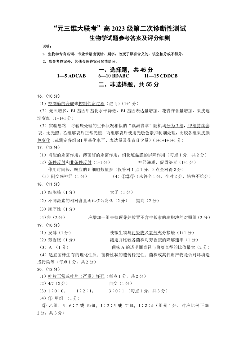 “元三维大联考”2023级高三第二次诊断考试 生物答案.docx