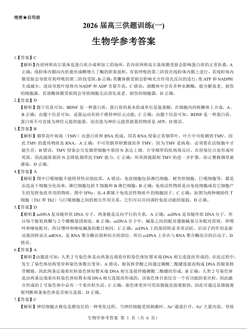 辽宁省2026届高三供题训练(一)生物参考答案.docx