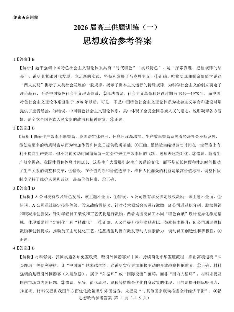 云南省2026届高三供题训练(一)政治参考答案.docx