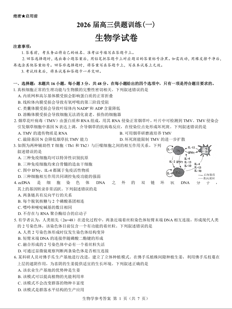 云南省2026届高三供题训练(一)生物试题.docx