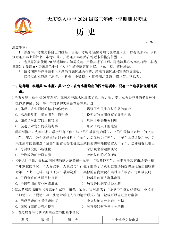 大庆铁人中学2024级高二年级上学期期末考试 历史.pdf