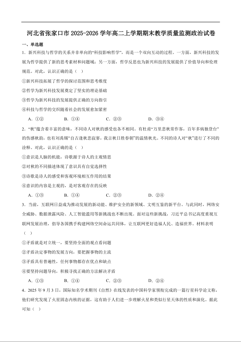 河北省张家口市2025-2026学年高二上学期期末教学质量监测 政治试题(含答案).docx