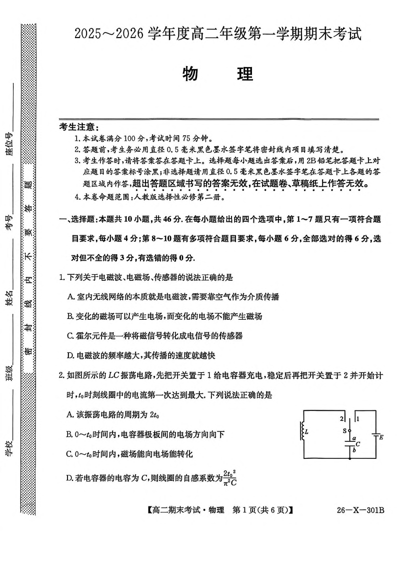 黑龙江省龙东十校联盟2025-2026学年高二上学期期末考试 物理试题(含答案).pdf