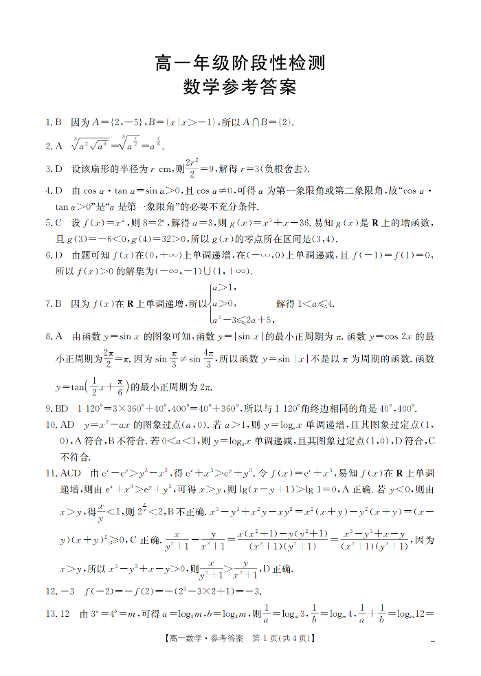 甘肃省陇南地区2025-2026学年高一上学期阶段性检测 数学答案.pdf