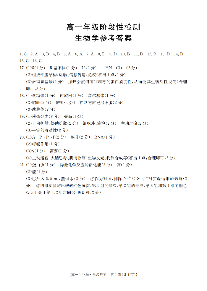 甘肃省陇南地区2025-2026学年高一上学期阶段性检测 生物答案.pdf
