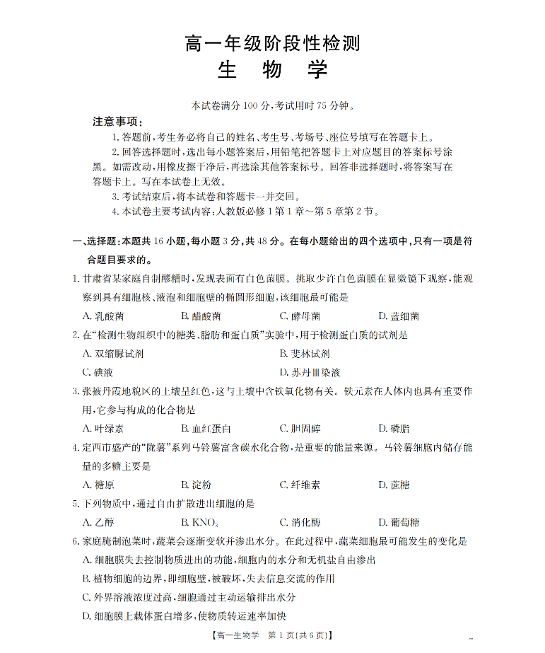甘肃省陇南地区2025-2026学年高一上学期阶段性检测 生物.pdf