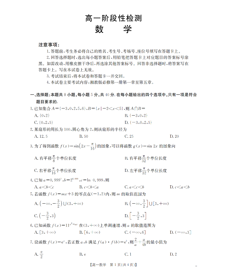 甘肃省天水市2025-2026学年高一上学期1月月考阶段性检测 数学.pdf