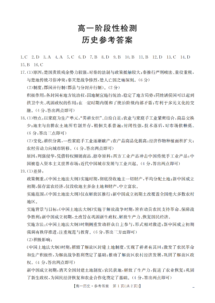 甘肃省天水市2025-2026学年高一上学期1月月考阶段性检测 历史答案.pdf