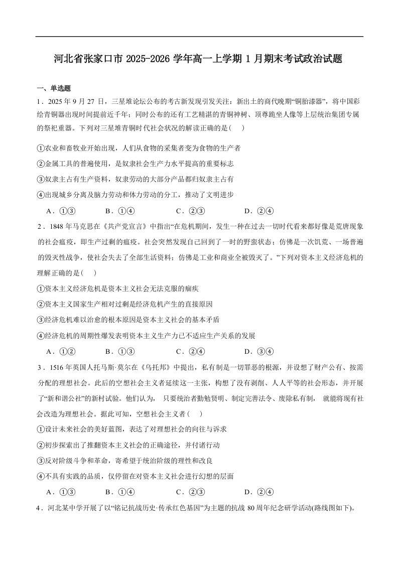 张家口市2025-2026学年高一年级第一学期期末教学质量监测 政治试题(含答案).docx