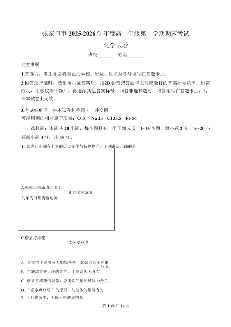 张家口市2025-2026学年高一年级第一学期期末教学质量监测 化学试题(含答案).docx