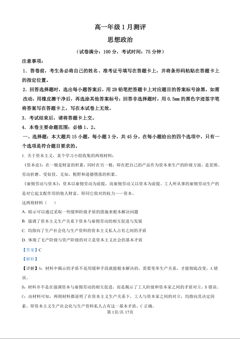 河南省新未来2025-2026学年高一上学期1月测评 政治答案.docx