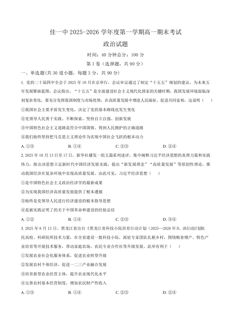 佳木斯市第一中学校2025-2026学年高一上学期1月期末考试 政治试题(含答案).docx