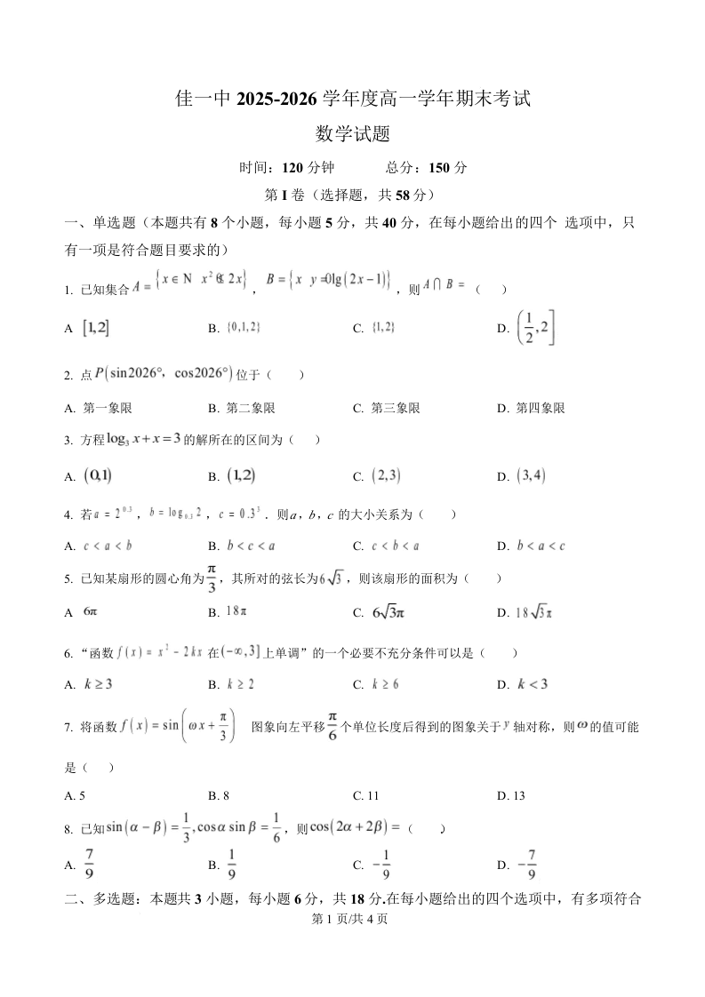 佳木斯市第一中学校2025-2026学年高一上学期1月期末考试 数学.docx