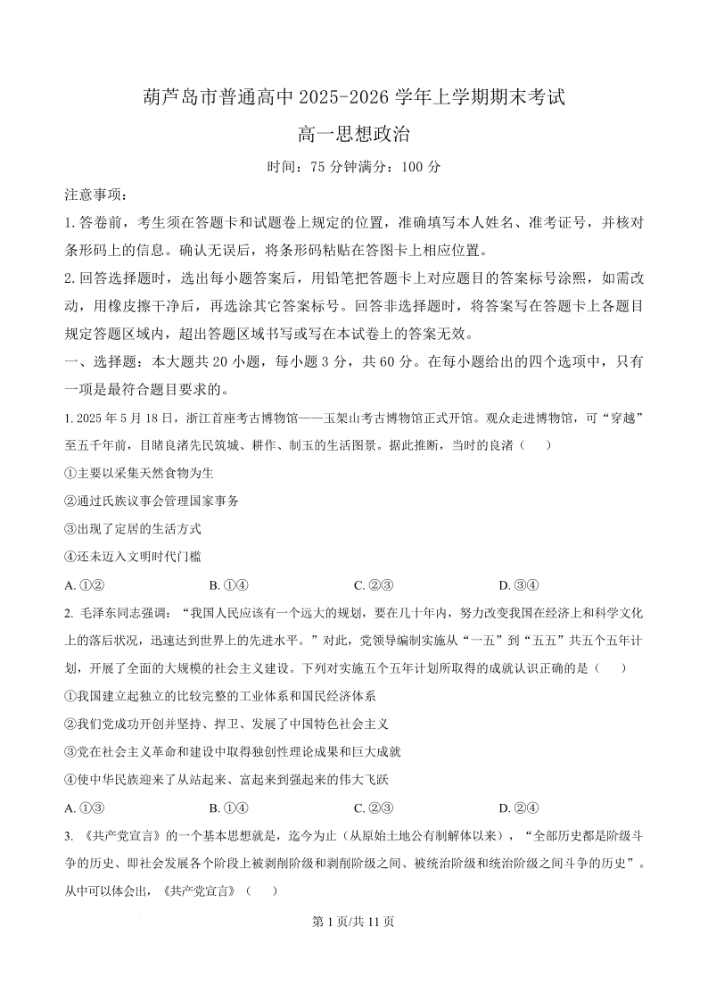 辽宁省葫芦岛市普通高中2025-2026学年上学期高一年级1月期末考试 政治.pdf
