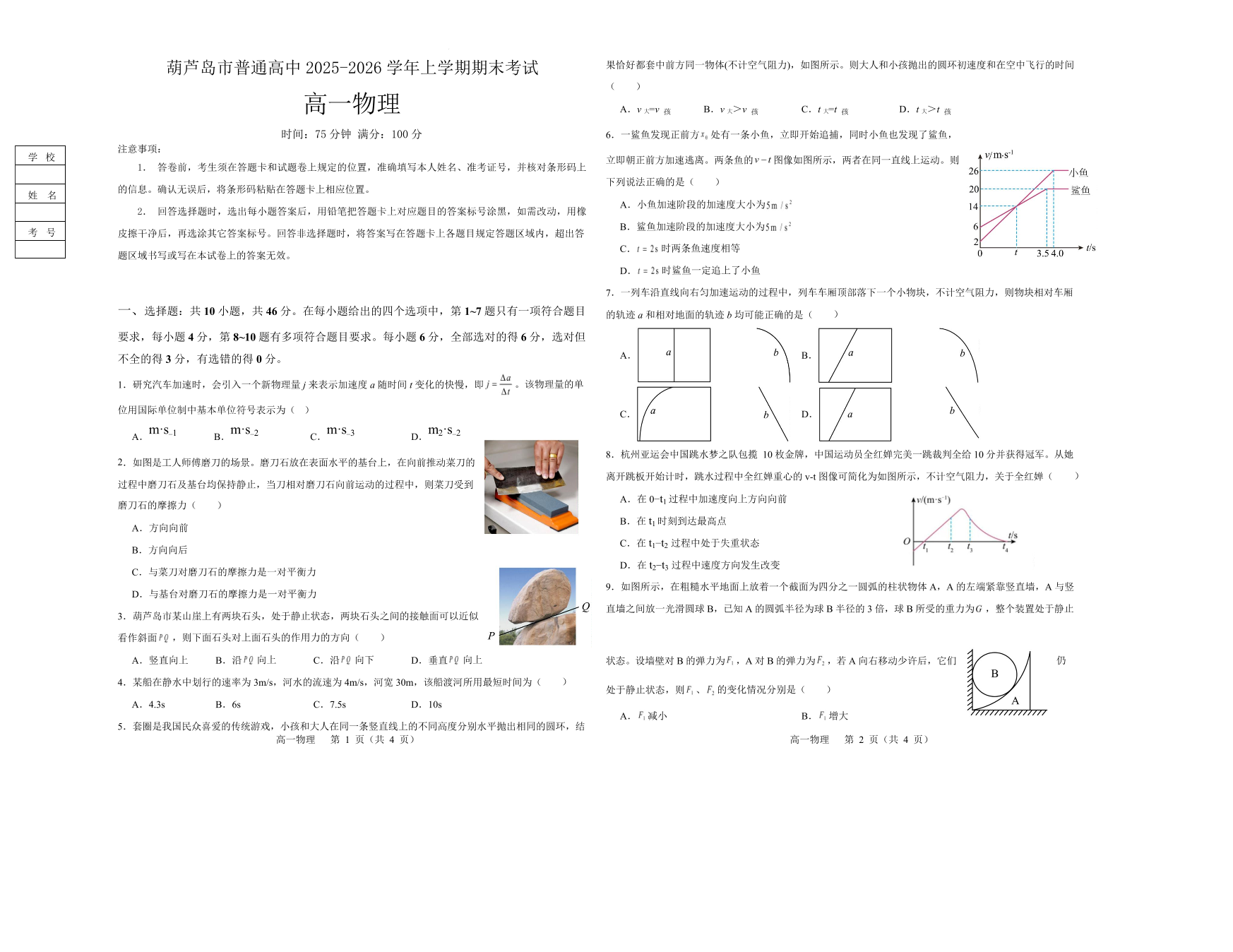 辽宁省葫芦岛市普通高中2025-2026学年上学期高一年级1月期末考试 物理.pdf