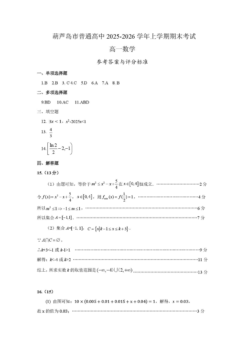 辽宁省葫芦岛市普通高中2025-2026学年上学期高一年级1月期末考试 数学答案.pdf