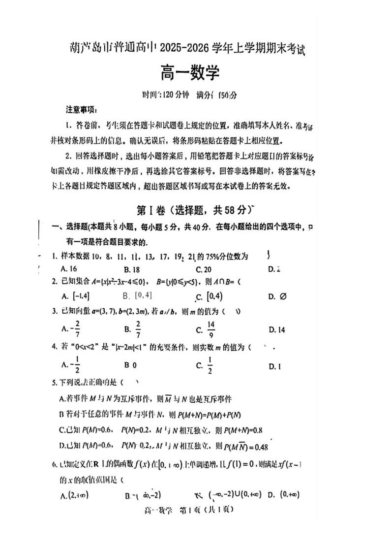 辽宁省葫芦岛市普通高中2025-2026学年上学期高一年级1月期末考试 数学.pdf
