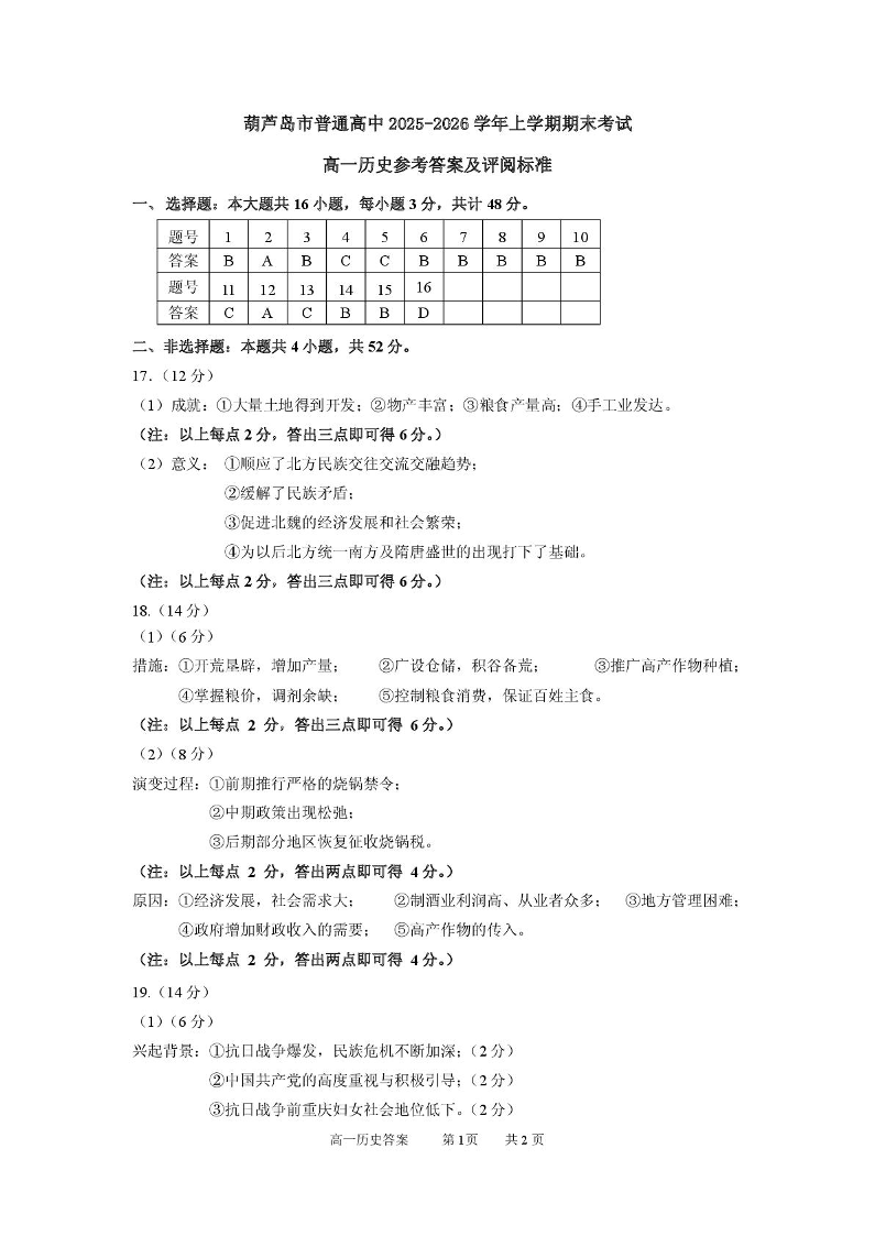 辽宁省葫芦岛市普通高中2025-2026学年上学期高一年级1月期末考试 历史答案.pdf