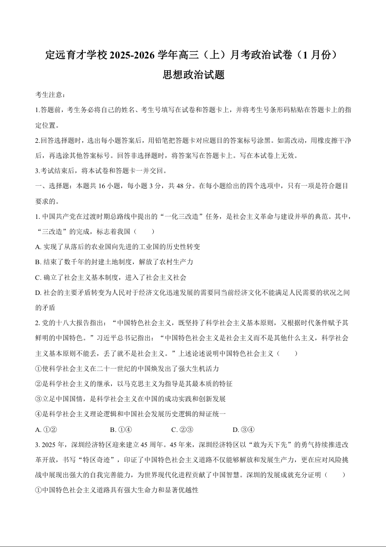安徽省滁州市定远县育才学校2025-2026学年高三上学期1月月考 政治试题(含答案).docx