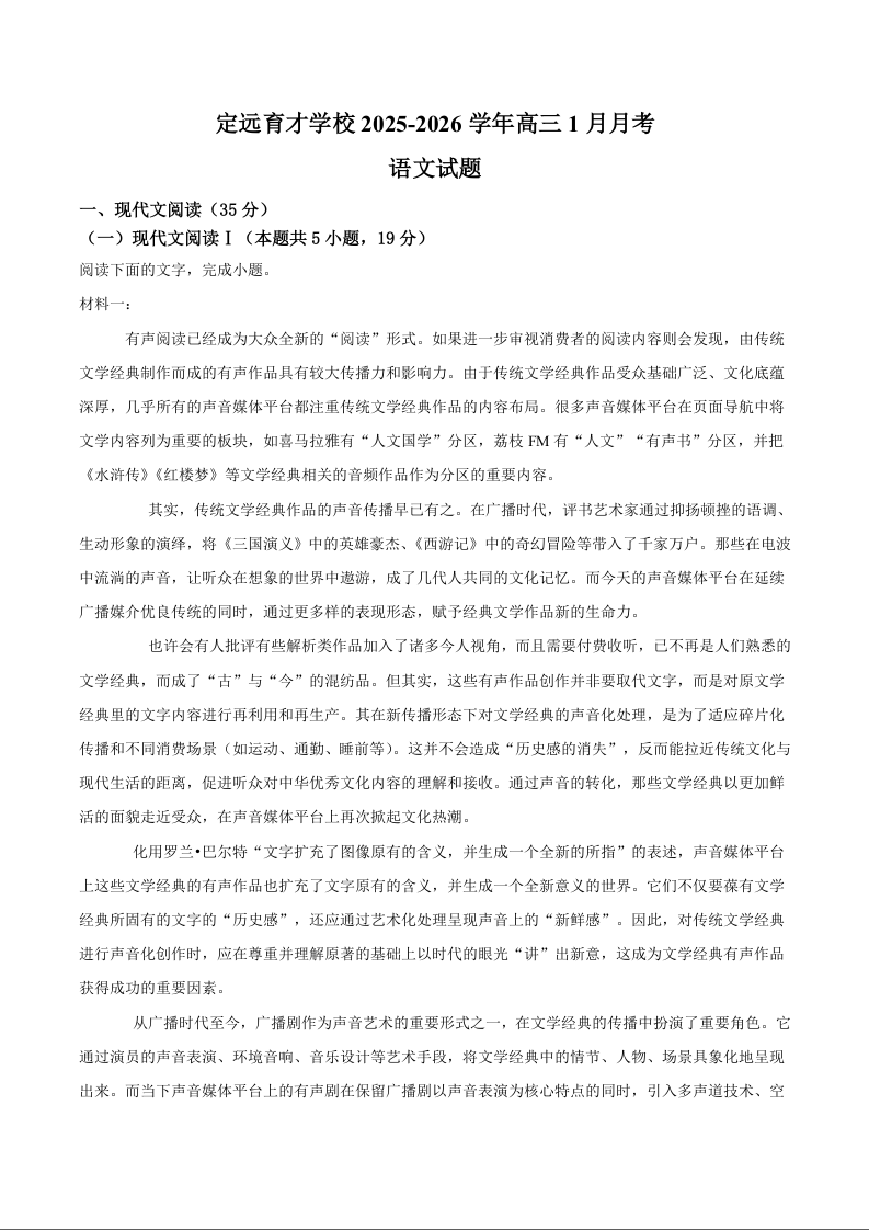 安徽省滁州市定远县育才学校2025-2026学年高三上学期1月月考 语文试题(含答案).docx