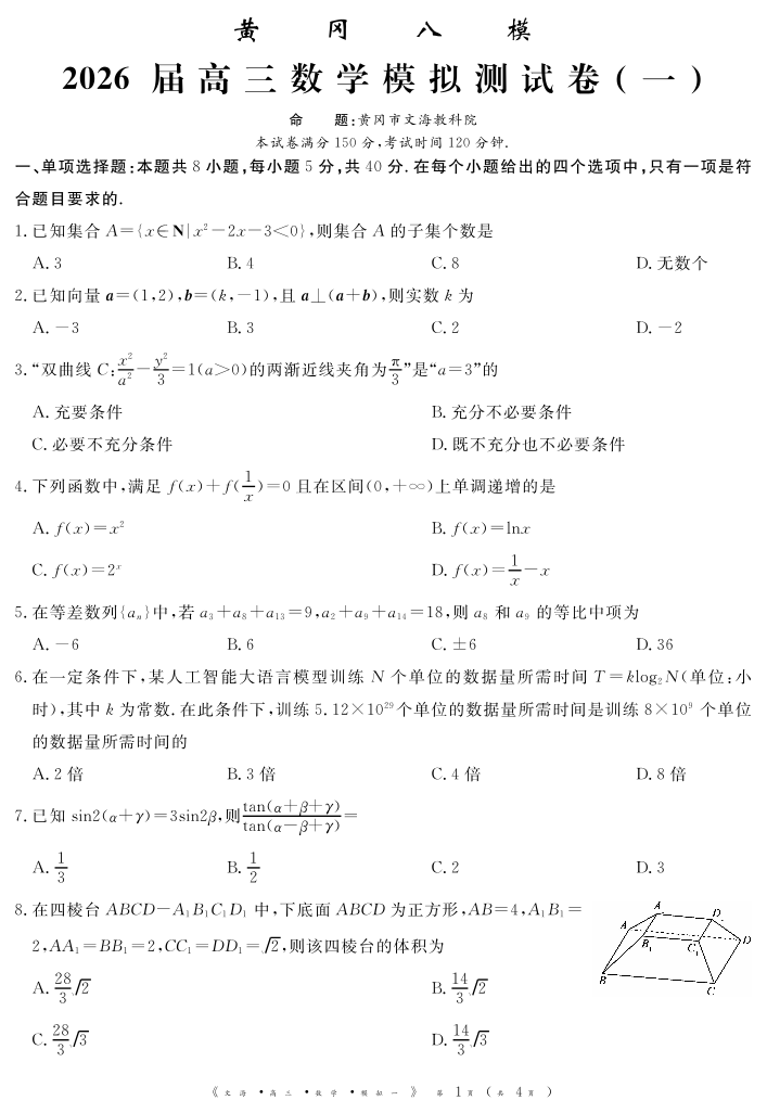 黄冈八模2026届高三模拟测试卷(一)数学试题(含答案).pdf