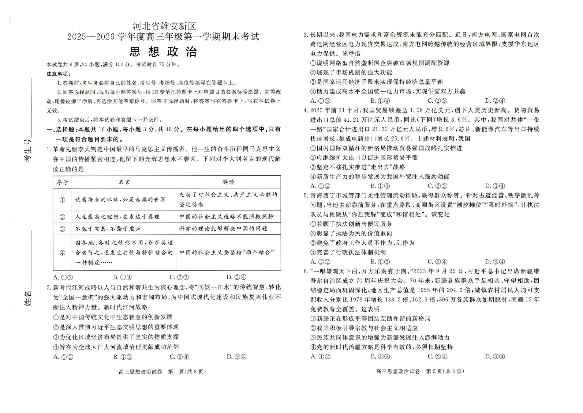 雄安新区2025—2026学年度高三年级第一学期期末考试 政治.pdf