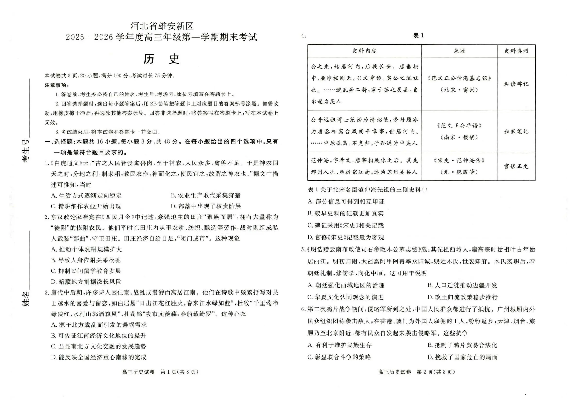 雄安新区2025—2026学年度高三年级第一学期期末考试 历史.pdf