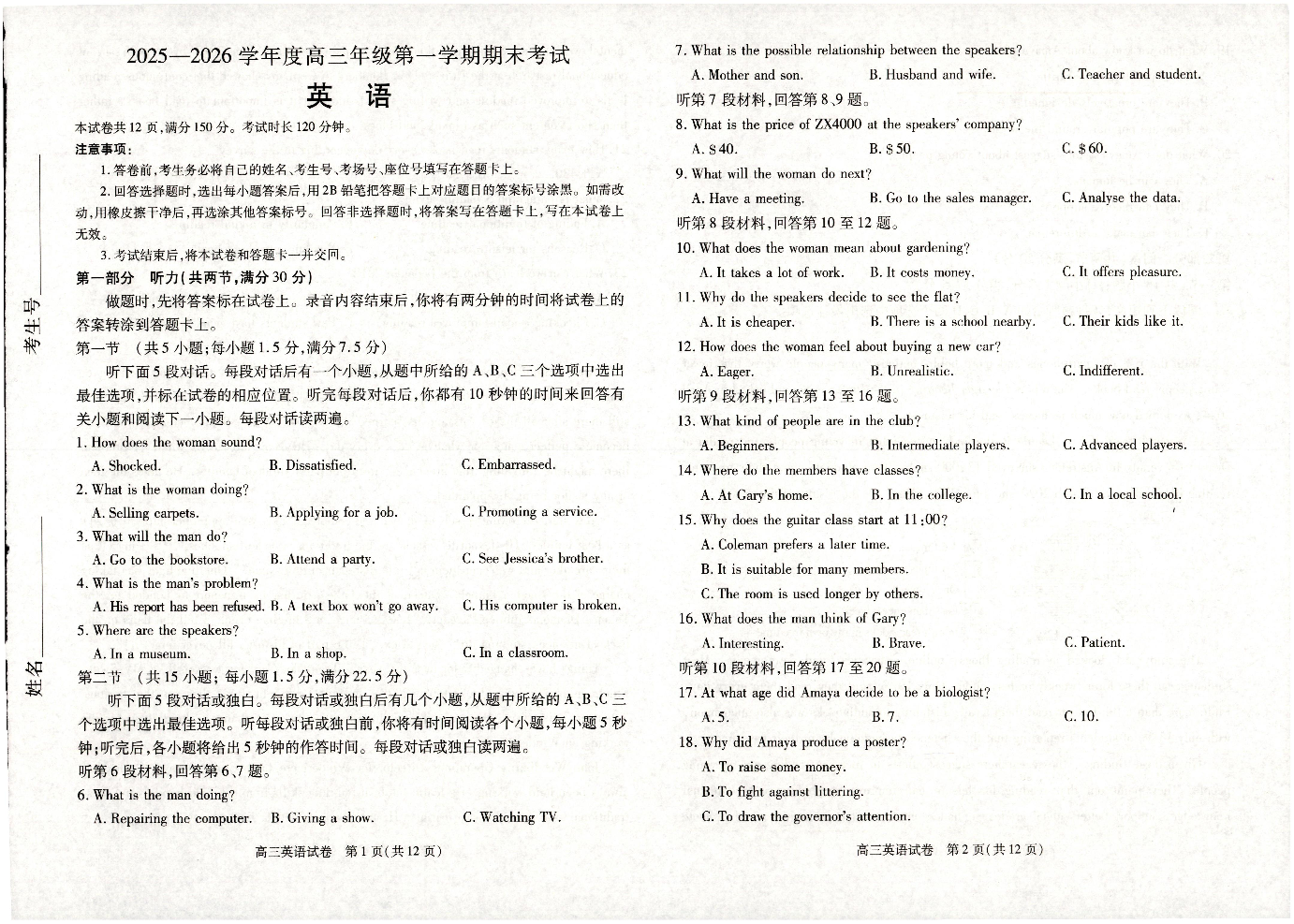 唐山市2025-2026学年度高三年级第一学期期末考试 英语.pdf