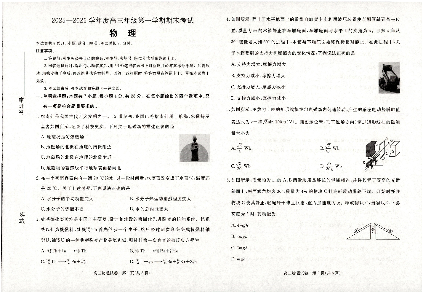 唐山市2025-2026学年度高三年级第一学期期末考试 物理.pdf