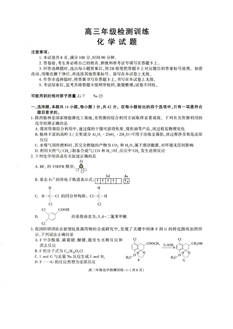 陕西省榆林市2026届高三年级检测训练 化学.pdf