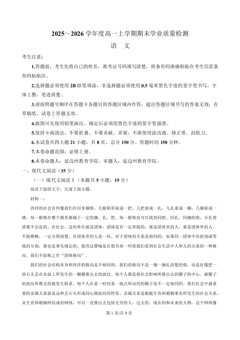 延边朝鲜族自治州2025-2026学年度上学期高一年级期末学业质量检测 语文试题(含答案).docx