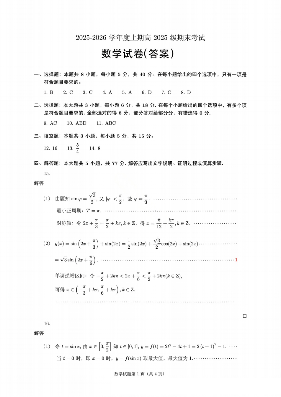 成都市第七中学2025-2026学年度上期高2028届高一期末考试 数学答案.pdf