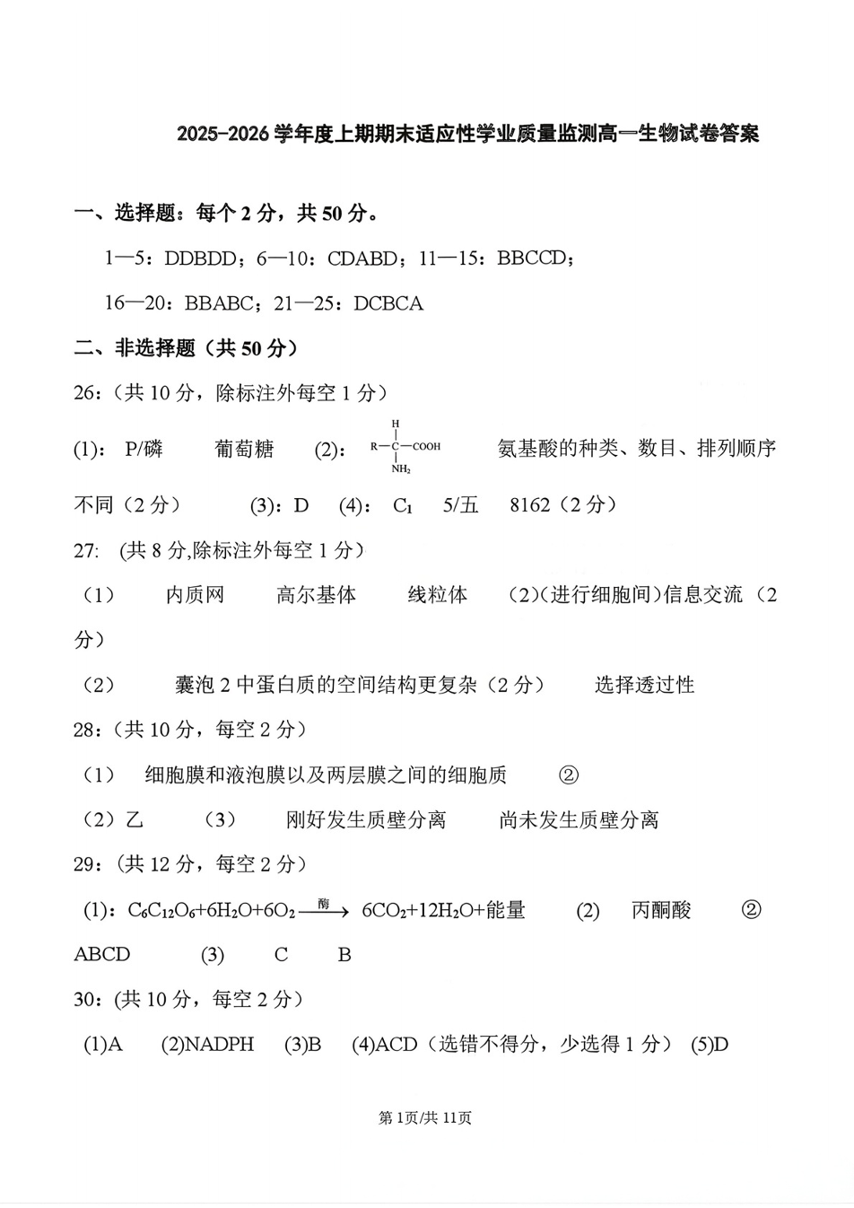 成都市第七中学2025-2026学年度上期高2028届高一期末考试 生物答案.pdf