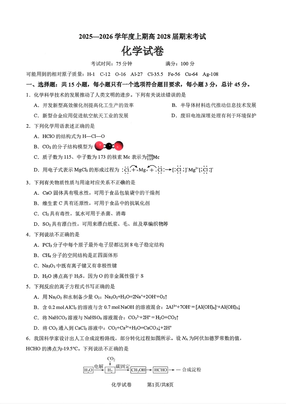 成都市第七中学2025-2026学年度上期高2028届高一期末考试 化学.pdf