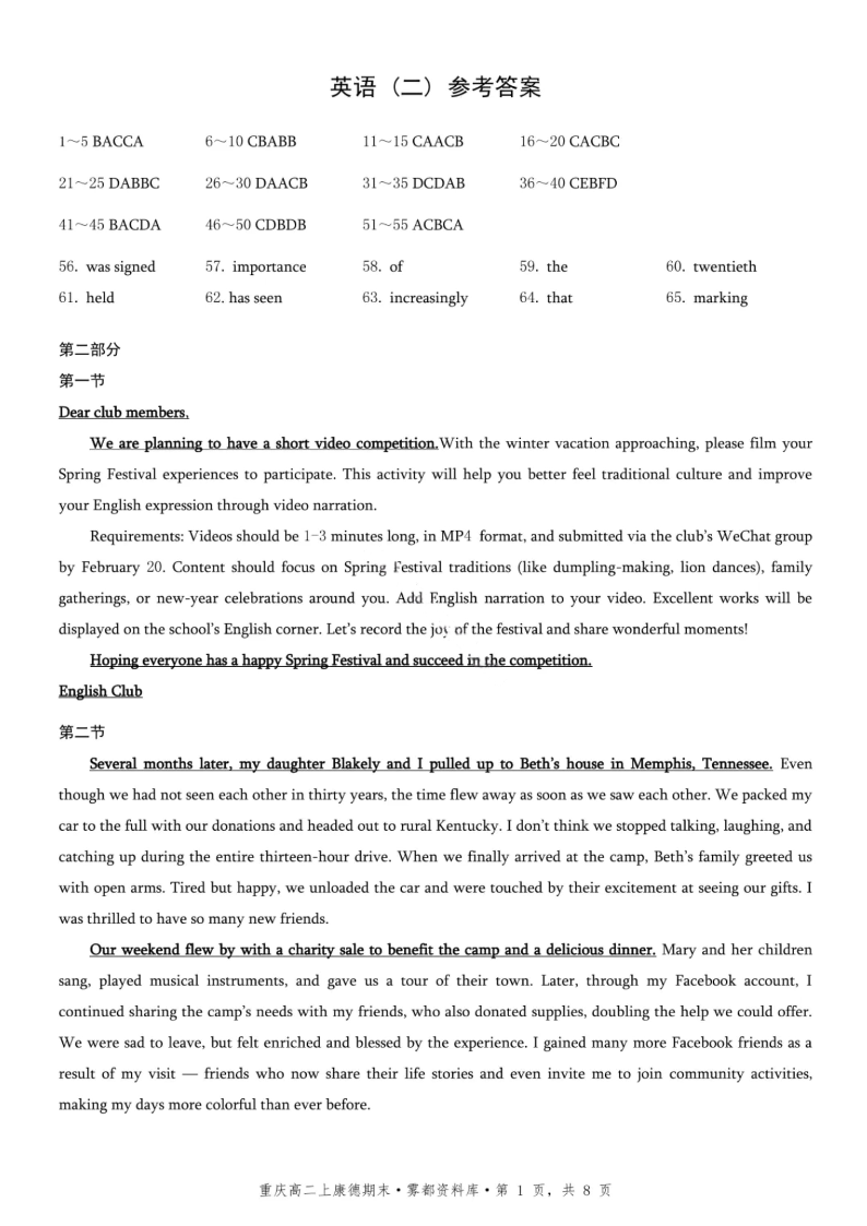重庆市康德教育·2027届重庆市高二上学期1月期末考试 英语答案.pdf