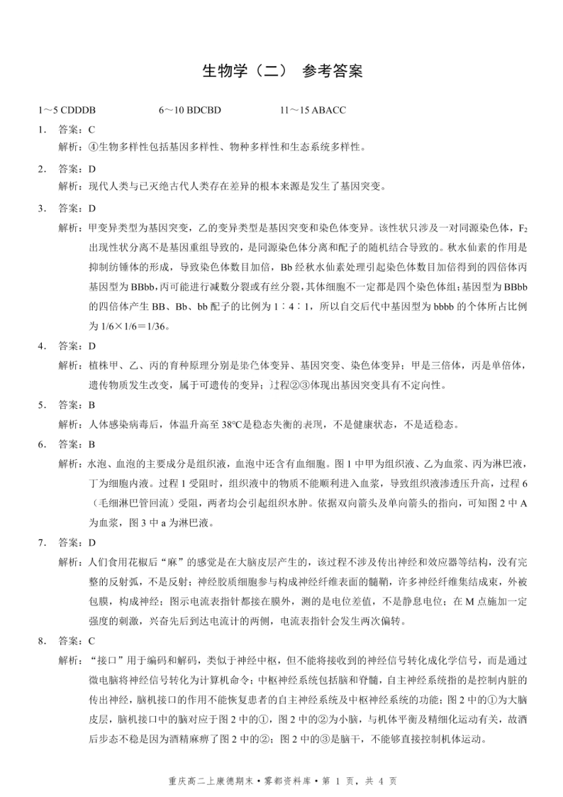 重庆市康德教育·2027届重庆市高二上学期1月期末考试 生物答案.pdf