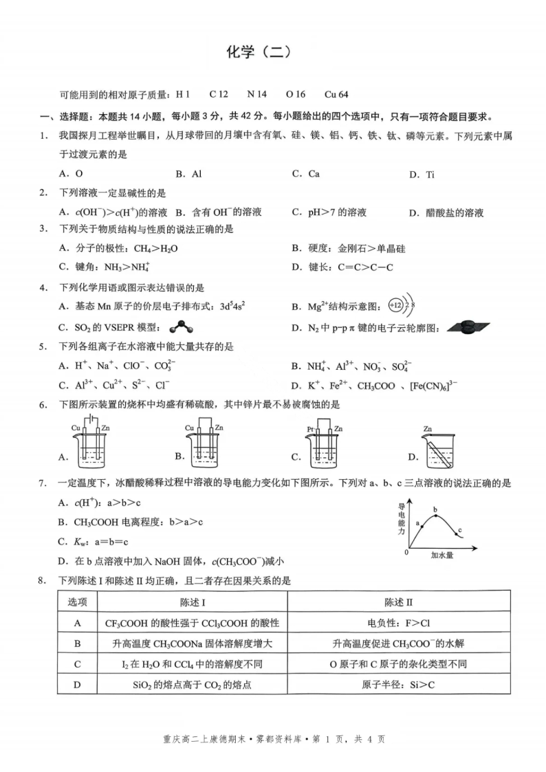 重庆市康德教育·2027届重庆市高二上学期1月期末考试 化学.pdf