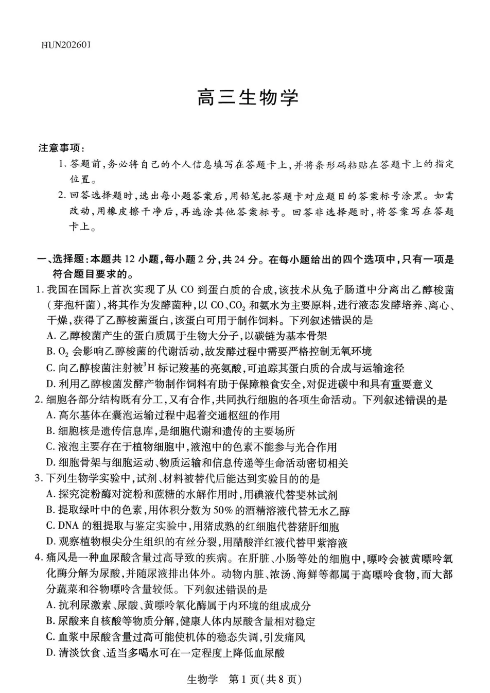 湖南省2025-2026学年高三上学期1月期末考试 生物.pdf